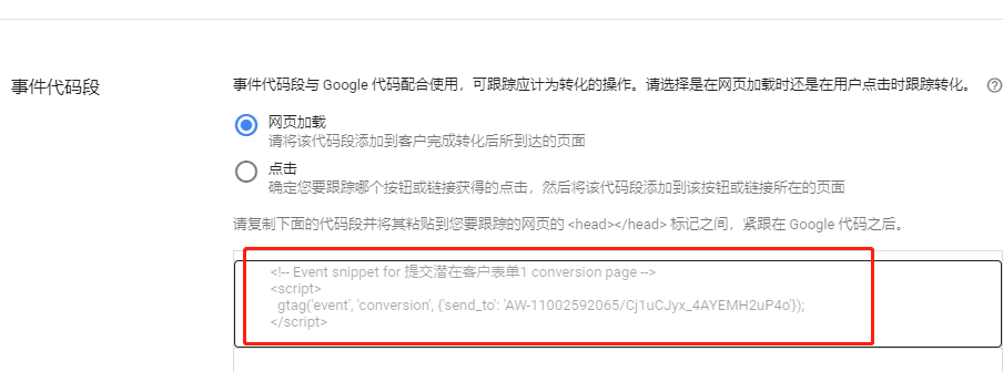 选择“网页加载”,将里面的一串代码加在每个在线表单组件设置里的跟踪代码里,如下图所示: