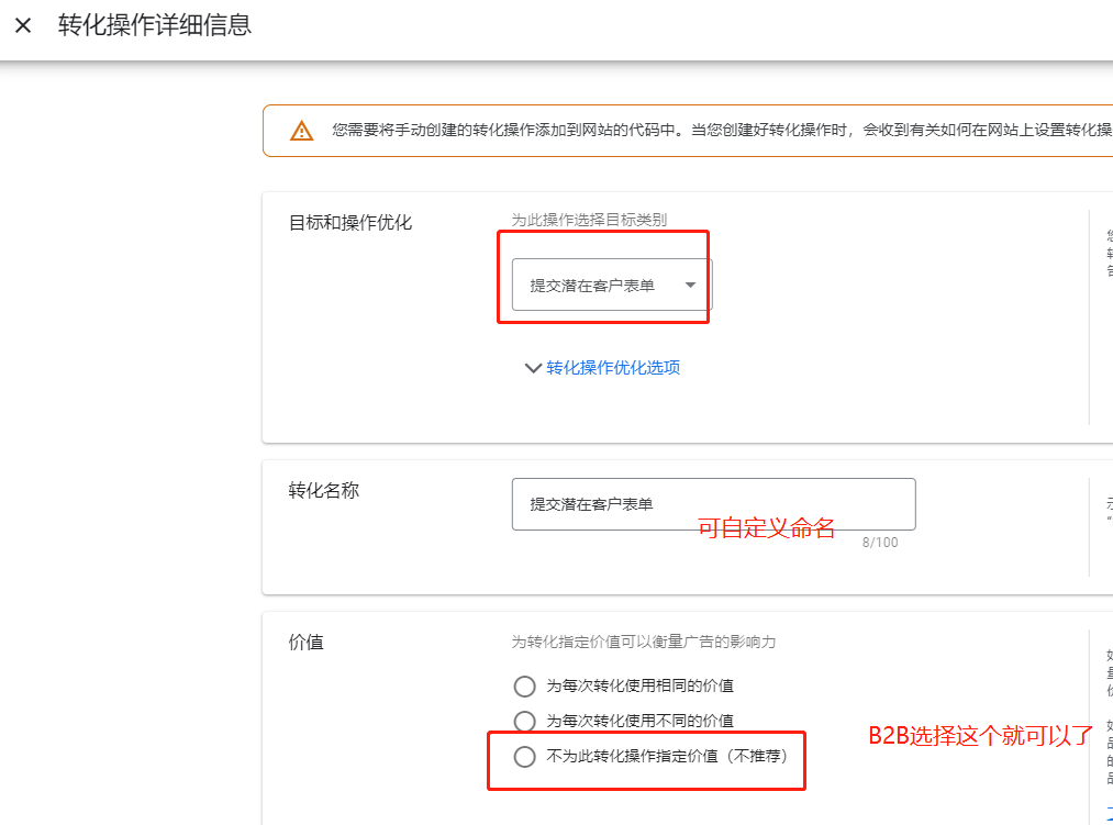 B2B网站的转化价值就是这个询盘的价值。因为B2B网站在询盘阶段还没有成单,所以可以不设置转化价值,也可以设置一个固定的询盘价值。