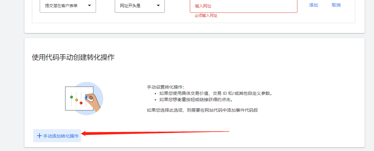 第二步:进入后选择“网站”,输入网站域名,选择手动添加转化操作,进入后需要填写转化操作的信息,如下图所示: